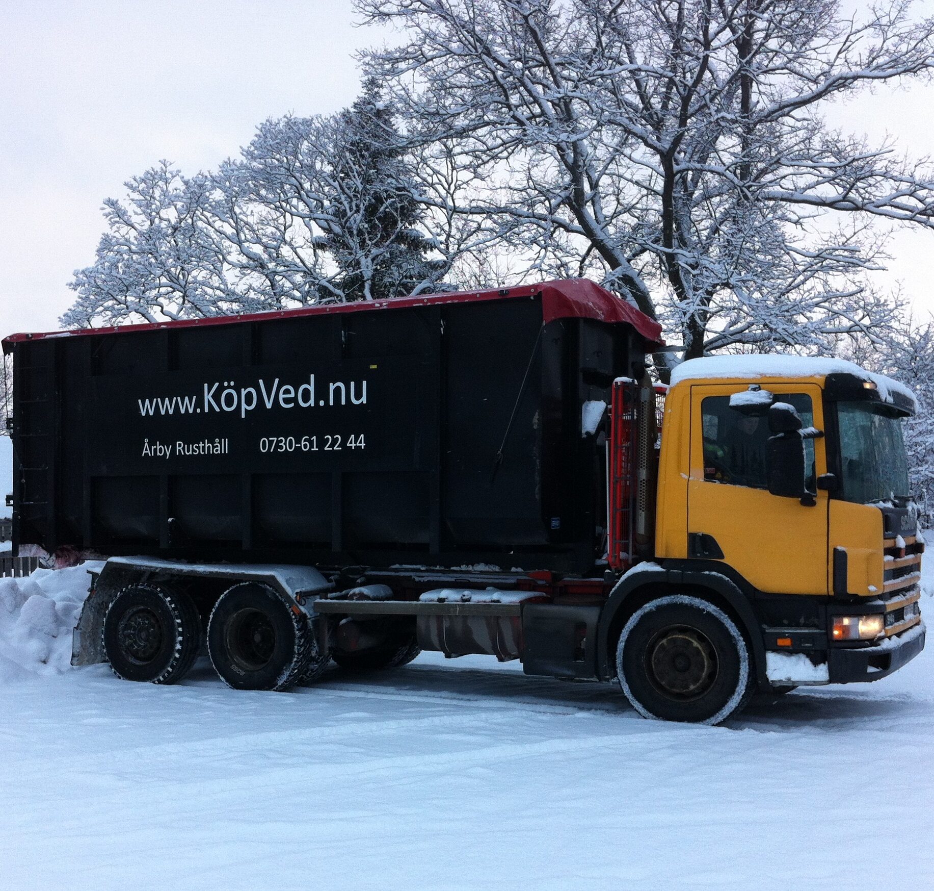 Rå ved levereras i container med tung lastbil och tippas av. Klicka på Offert-knappen och fyll i dina uppgifter. För att ge dig ett pris behöver vi veta önskad volym, längd på vedträna och din adress.